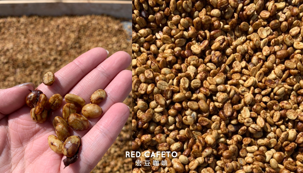 紅蜜:果膠刮除20%左右,各莊園做法有異,進行乾體發酵,並晾在戶外的高架網,帶殼豆會變成紅褐色